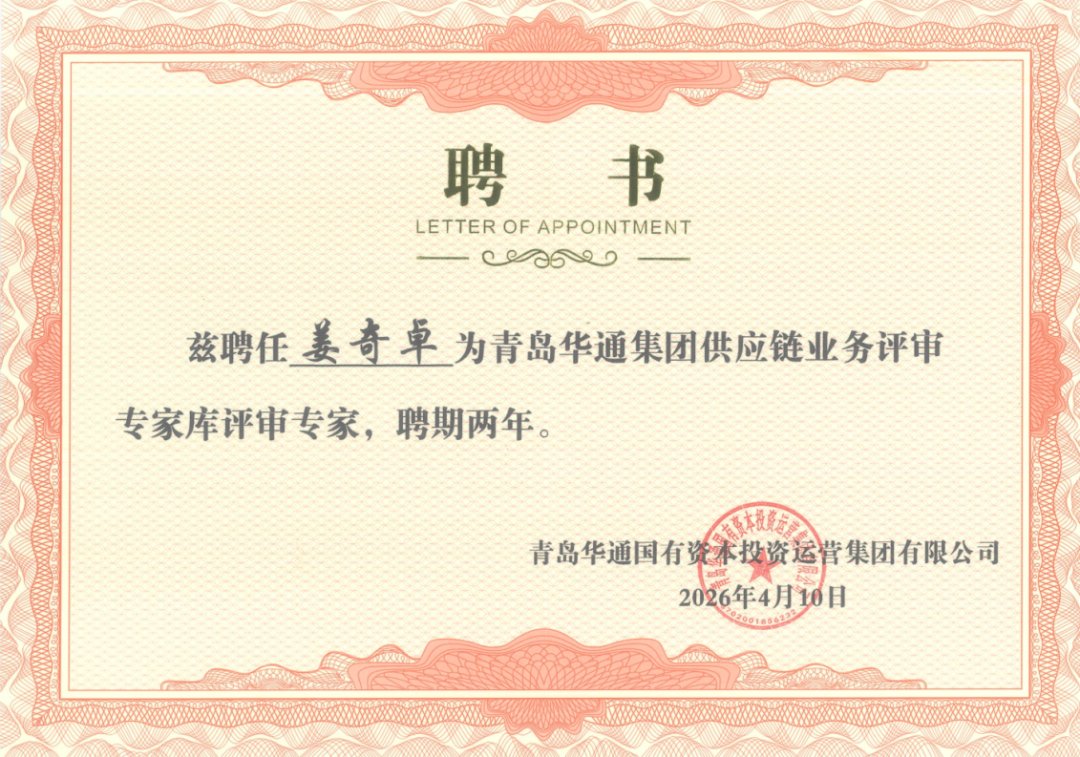 喜报!上海金茂凯德(青岛)律师事务所姜奇卓律师受聘青岛华通集团供应链评审专家